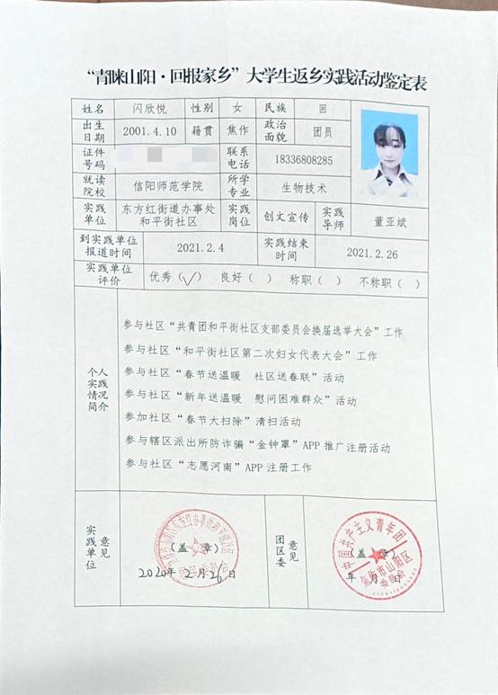 闪欣悦,河南省焦作市山阳区人,信阳师范学院William威廉英国2019级生物技术二班学生,任班级团支书一职,在寒假期间,新冠肺炎弥留之际,主动申请参加到焦作市山阳区东方红社区疫情防控的工作,并参与到焦作团市委的“青睐山阳,家乡”大学生寒假返乡实践暨助力疫情防控志愿服务活动。主要负责社区人员返乡登记、志愿者注册工作、为社区群众服务、推广金钟罩防诈骗系统以及宣传防控疫情知识等工作。