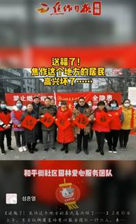 在东方红社区经历了各种前期准备下,迎来了中国的重大节日——春节。但是由于疫情原因,少了很多热闹气氛,为此,社区请来了当地有名的毛笔字高手,为居民们免费写了一上午的对联和门对,闪欣悦所在社区还有幸上了焦作日报。期间,闪欣悦同学以及其他志愿者维持在场秩序,帮忙倒墨、换纸、压线,晾干成品后有序发放给大家,看着居民们一个个高兴的面容不禁心生安慰。