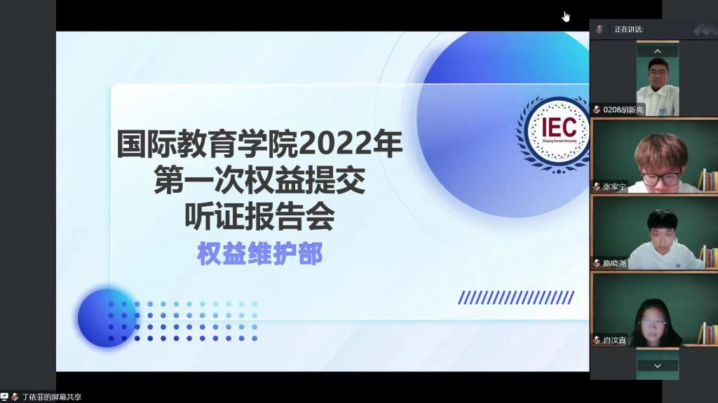 为进一步加强学生维权意识,了解更多维权方法和权益落实情况,更好开展各项维权工作,我院举行2022年度线上权益提交听证报告会。校学生会权益部门负责人、我院权益部门负责人及各班权益委员参加此次报告会。