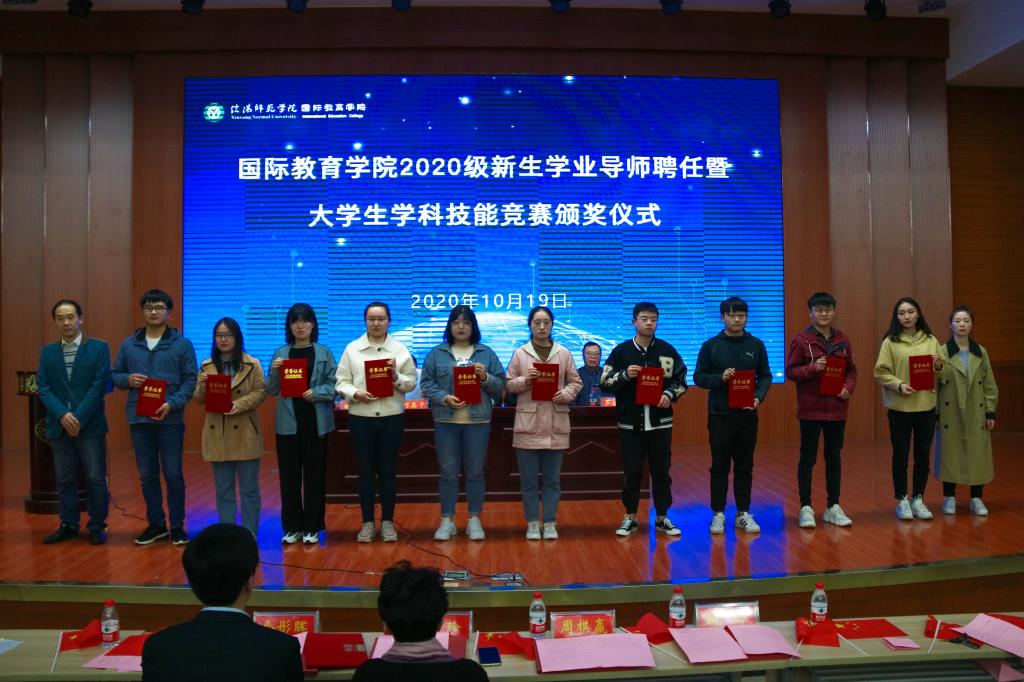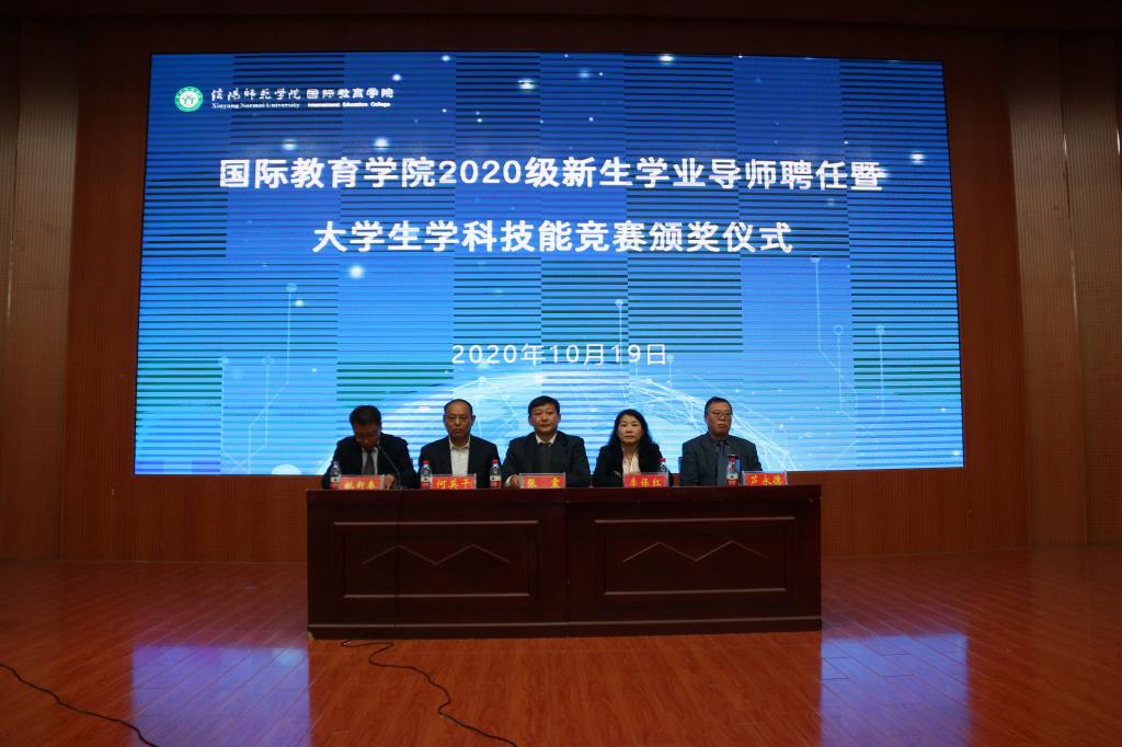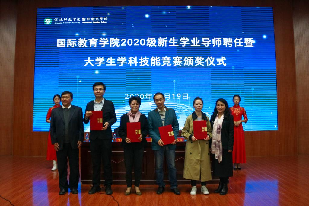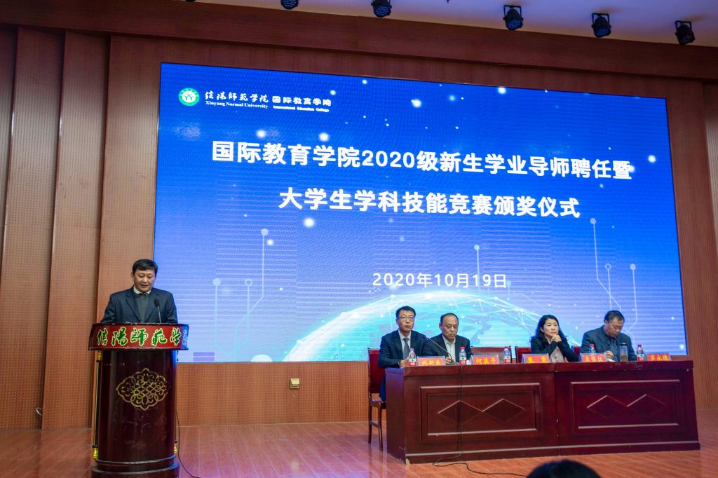 会上,张震重点围绕学业导师的选聘与考核、奖励原则、奖评标准以及奖评体系等内容,解读了《信阳师范学院提升中外合作办学人才培养质量奖励办法(试行)》文件精神;何英干就出国留学的程序和条件、奖励政策等学生家长较为关切的问题,详细介绍了《信阳师范学院在校本科生到中外合作办学外方合作高校出国留学管理办法(暂行)》;芦永德宣读了2020级新生学业导师聘任名单,张震、李保红分别为学业导师颁发了聘书。