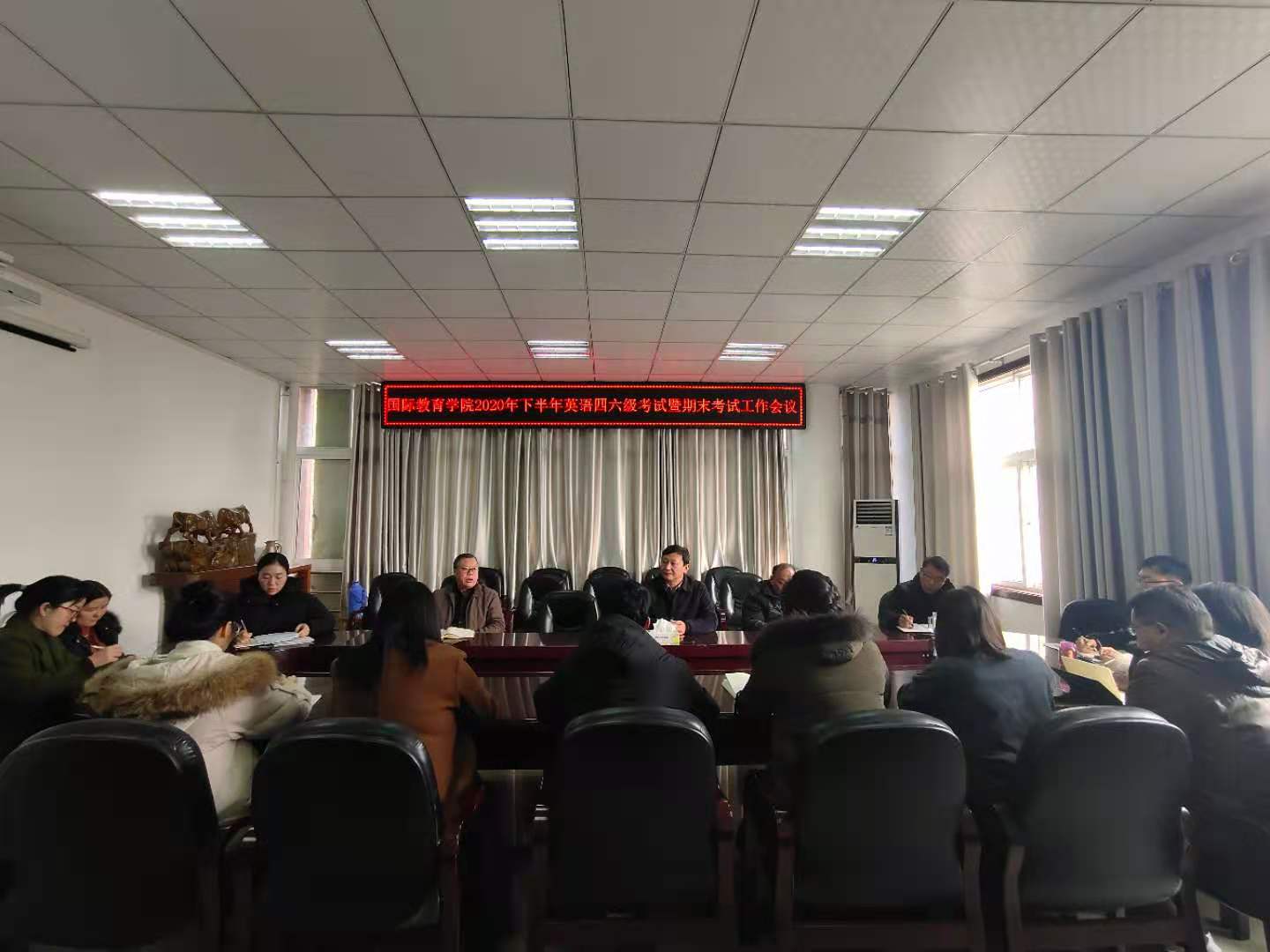 12月8日,在逸夫楼302召开专题会议,安排部署我院2020年下半年全国大学英语四六级考试和本学期期末考试工作。院党委书记张震,副院长何英干,副院长芦永德、党委副书记姚新春出席会议,学工部、教学部、办公室、项目办以及各语言教研室老师参加会议。会议由张震主持。