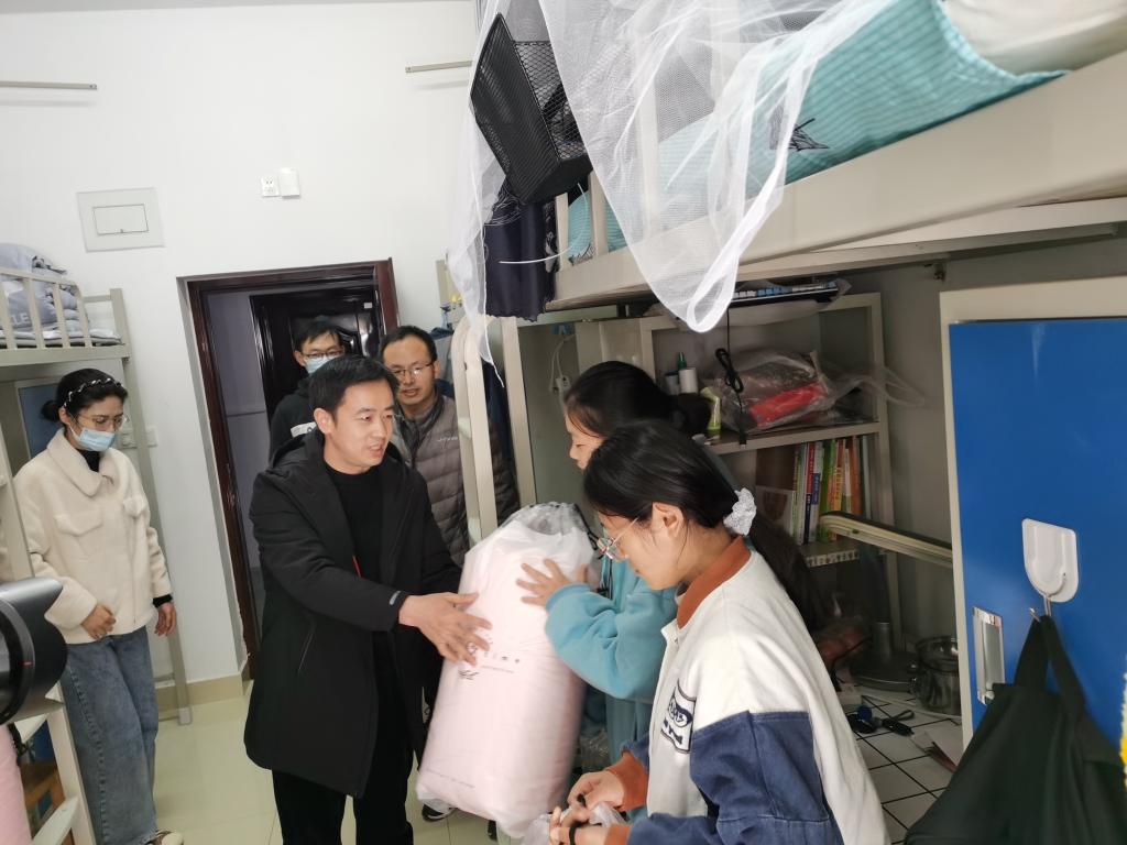 院党委书记李舟同学生进行亲切交谈,详细询问了他们的生活、学习情况,向冬季防寒衣被不足的家庭经济困难学生送去了爱心棉被。李舟勉励他们把生活上暂时的困难化作勤奋学习的动力,珍惜来之不易的求学机会,努力提高自身综合素质和专业知识水平,挥洒青春热血,在砥砺奋进中实现“弯道超车”,在服务和奉献社会中彰显个人价值。
