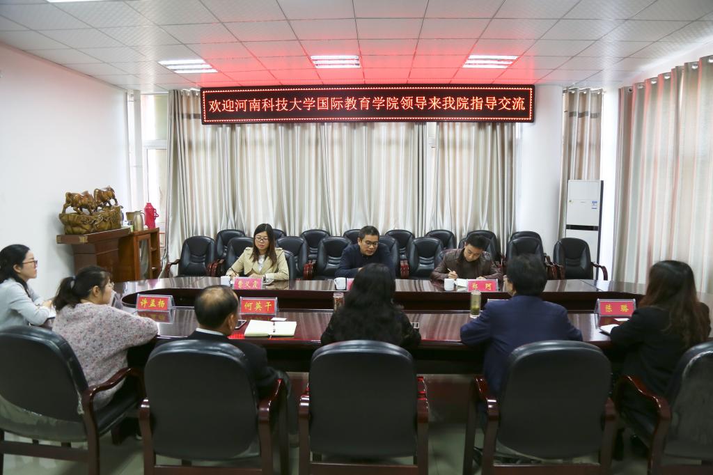 会上,李保红首先欢迎王春一行来我校传经送宝,重点介绍了我院的发展历程、办学成就及日常工作经验和做法,希望双方深入沟通,相互借鉴,共同进步,共谋发展。何英干就项目基本情况、项目申报及学生出国留学工作作了简单介绍。教学部主任郭寻就项目培养方案、教学管理工作等进行了汇报。王春对我院的办学成就表示赞赏,并简要介绍了河南科技大学William威廉英国的发展历程和发展成就。双方围绕中外合作办学项目中的小语种外语教学、出国留学、教务管理、学生管理等问题进行了深入交流。