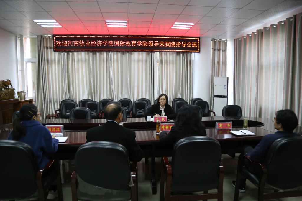 会上,李保红首先对高敏的到访表示热烈欢迎,简要介绍了我院的发展历程、工作经验和做法,希望双方深入沟通,相互借鉴,共同进步,共谋发展。何英干就项目基本情况、项目申报与建设、项目学生出国留学等工作作了简单介绍。教学部主任郭寻就项目人才培养方案修订、教学管理等工作进行了汇报。高敏对我校中外合作办学取得的成绩表示祝贺,简要介绍了河南牧业经济学院中外合作办学的现状。双方围绕中外合作办学项目申报、出国留学、教务管理等问题进行了深入交流和探讨。