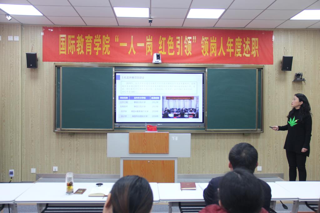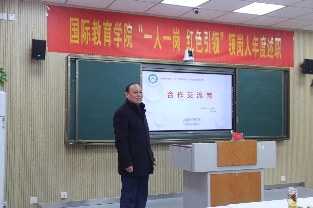 领岗人立足岗位职责逐一向大会进行汇报。党建引领岗领岗人张震围绕党的建设“第一责任人”履职情况、扎实做好巡视整改的“后半篇文章”、牢牢把握意识形态的领导权主动权以及党风廉政建设等工作进行述职;事业发展岗领岗人李保红围绕中外合作办学项目工作、出国留学、国际交流与合作以及人才培养等进行述职;合作交流岗领岗人何英干围绕中外合作办学的深度和广度进行述职;学风建设岗领岗人姚新春围绕厚植爱国情怀、开拓国际视野、强化语言基础以及提升专业素养等进行述职;教学监控岗领岗人郭寻围绕人才培养方案、课程设置、教师选派等教学监控管理工作进行述职;海外联络岗领岗人陈璐围绕海外学生教育管理服务工作进行述职;创新创业岗领岗人竹梅围绕学院创新创业工作开展情况进行述职;志愿服务岗领岗人许孟杨围绕学院志愿服务开展情况进行述职;贫困帮扶岗领岗人吴浩围绕学院资困助学工作进行述职。