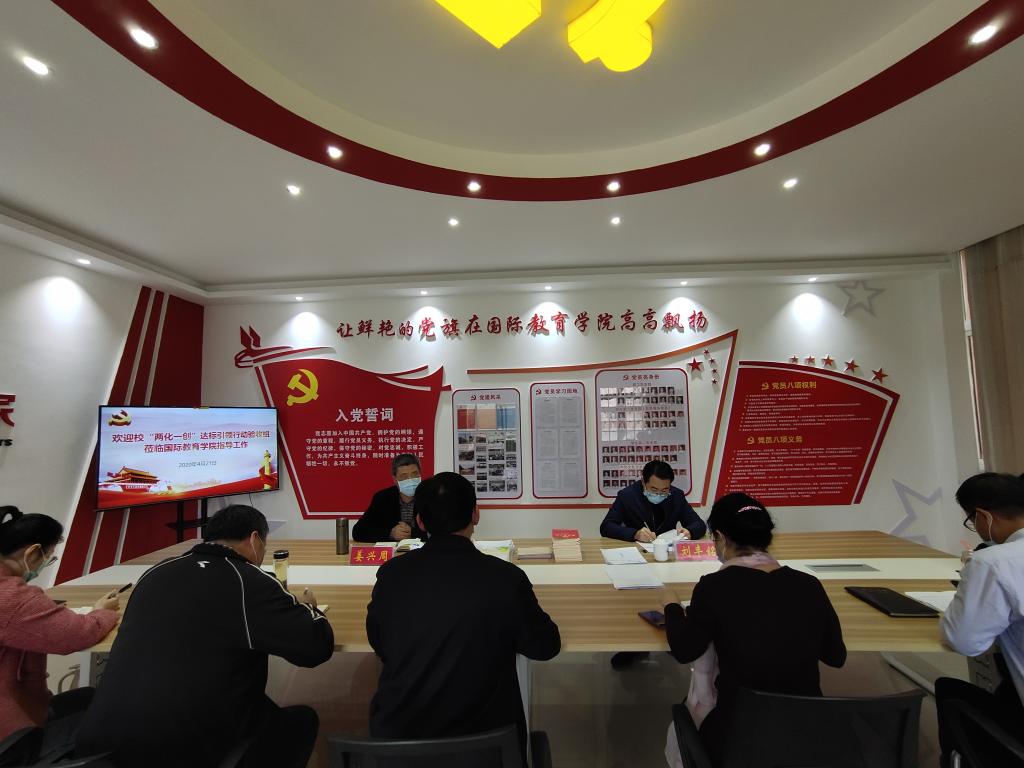 4月21日下午,校“两化一创”达标引领行动验收工作第三验收组组长姜兴周、成员刘丰铭莅临国际教育学院检查指导工作。学院党委书记张震、院长李保红,党委副书记姚新春以及各支部书记参加。会议由张震主持。