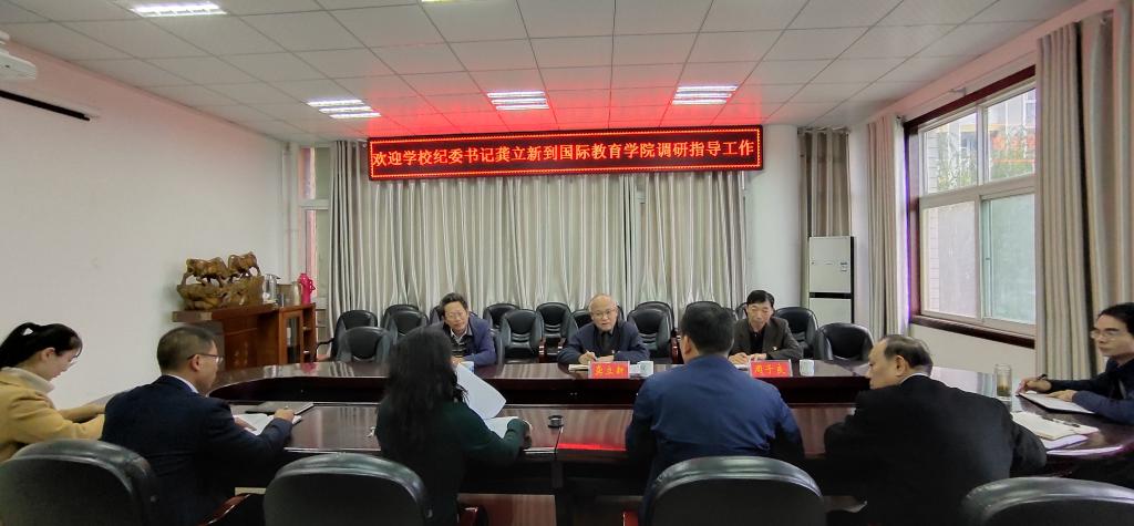 龚立新肯定了国际教育学院在扩大学校开放办学,促进国际交流,推进国际化人才培养等方面取得的成绩。他强调,在深入推进“不忘初心、牢记使命”主题教育中,学院要通过对表对标找差距,全面检视反思,深入调查和整改落实等工作切实破解制约瓶颈,保障事业健康持续发展,为学校高水平师范大学建设提供重要支撑。结合党风廉政建设,他提出十个方面要求:一是学思结合,要加强政治理论知识、业务知识、党史国史综合知识等方面学习,以理论滋养初心,在学思践悟中不断促进事业发展;二是担当尽责,要勇于担当、善于担当、乐于担当,要切实提升敢于担当的精神、善于担当能力和主动担当的境界;三是守正创新,要不断解放思想,以更加开放的办学视野,进一步引进优质教育资源,创新办学模式,加强学生国际交流,提升国际化人才培养水平;四是统揽全局,谋一隅要先谋全局,要树立全局观念,将中外合作办学工作纳入学校整体战略,在健康持续发展中提升服务学校中心工作能力;五是依法行政,要依法办学,加强制度建设,要做制度执行的表率,带动广大师生自觉尊崇制度、严格执行制度、坚决维护制度。六是心系群众,要深入群众,主动关心群众,不断增强教职工归属感、荣誉感和认同感,充分激发教职工干事创业热情;七是狠抓落实,要保持定力抓落实,精准精细抓落实,强化统筹抓落实,坚决把既定部署落实到位,真正把每个细节落实到位;八是团结协作,团结就是战斗力,要着力建设坚强有力的领导班子,形成整体合力,发挥整体功能,促进事业又好又快发展;九是狠抓队伍建设,要注重思想建设、能力建设,努力造就一支热爱中外合作办学事业、精通外事业务的职业型、专家型干部队伍。十是廉洁自律,党风廉政建设永远在路上,要提高思想认识,牢树红线意识、底线意识和规矩意识,坚守初心使命,通过主题教育的高质量开展积极营造良好的事业发展环境。