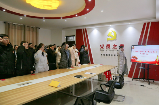 大会在《国际歌》的奏唱下拉开序幕,中外文化交流协会党支部书记陈璐同志宣读校党委组织部接收新党员的便函;学生第二党支部书记许孟杨同志带领新党员宣读入党誓词。“我志愿加入中国共产党,拥护党的纲领,遵守党的章程,履行党员义务,执行党的决定……”全体党员高举右拳,面对党旗、庄严宣誓,声音慷锵有力。