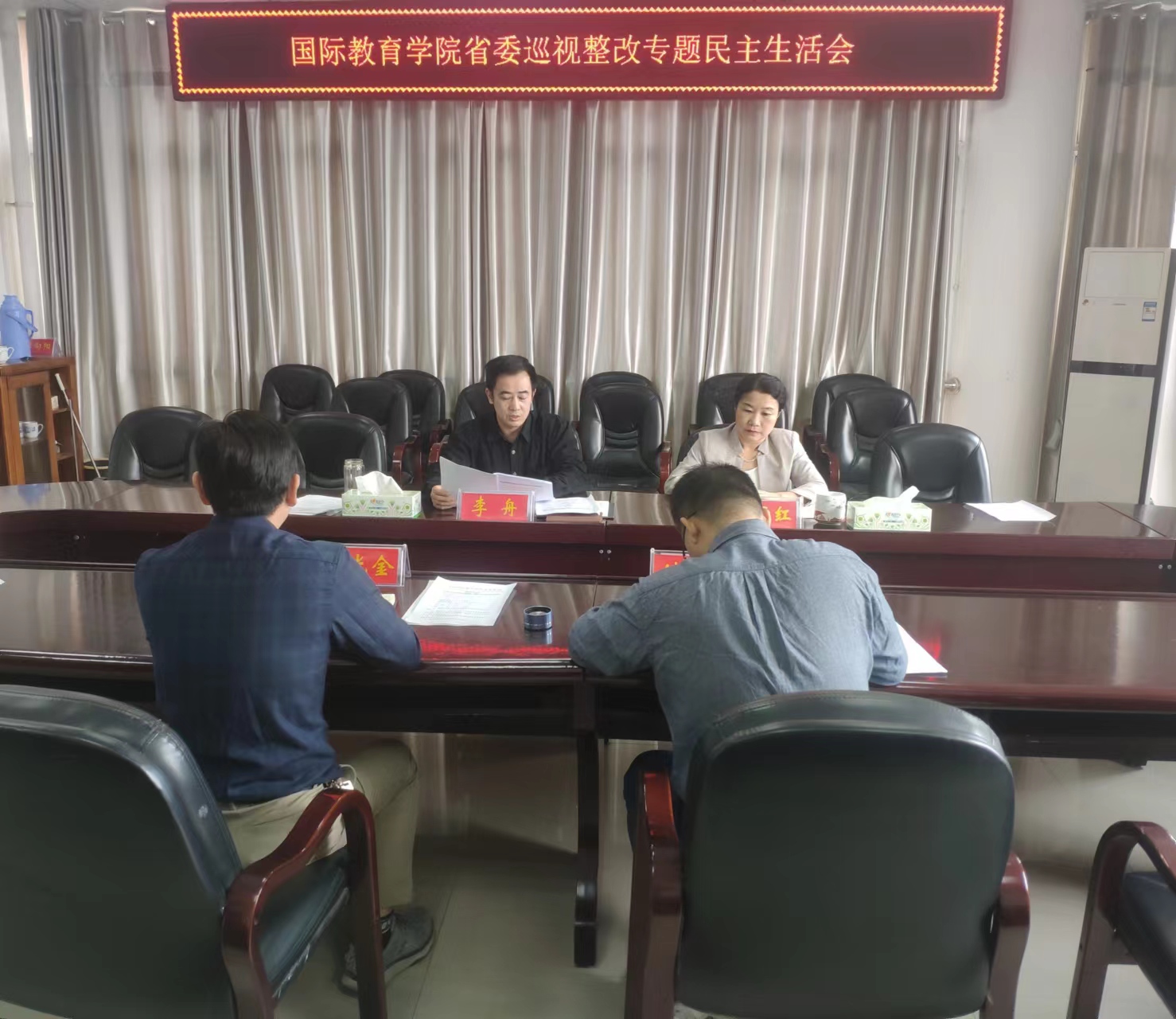 李舟就用好本次民主生活会成果,加强党委班子自身建设作了总结发言。他指出,本次民主生活会班子成员直面问题不躲闪、自我批评不隐瞒、相互批评不含糊,直奔主题、直指问题,推心置腹互提意见,起到了沟通思想、找准问题、增进团结的积极作用。大家要认真对待查摆问题、虚心接受批评意见,切实把民主生活会成果运用到中外合作办学工作实际中去,转化为提升工作能力、改进工作作风,推动事业发展提质增效的具体行动,同心同德,踔厉奋发,以实际行动迎接党的二十大胜利召开。一要加强党性淬炼。把巡视整改作为对党忠诚的具体检验,把坚定拥护“两个确立” 、坚决做到“两个维护”,深入推进全面从严治党体现在行动上、落实到工作中,压紧压实管党治党政治责任,举一反三真抓真改,落实“当下改”的治标举措,形成“长久立”的治本机制,为干事创业营造风清气正的政治生态。二要培养优良作风。贯彻落实以人民为中心的工作理念,坚持以上率下,大兴调查研究之风,切实增强八项本领,提高七种能力,踏实肯干、真抓实干、埋头“苦干”、勤政务实,在想师生之所想,急师生之所急上下足功夫,精准摸排师生急难愁盼,聚力解决师生反映强烈的现实问题。三要勇毅担当作为。切实把巡视整改成果转化为“挑重担、扛重责”的使命担当,以省委巡视反馈问题整改为契机,紧抓新时代教育对外开放带来的政策红利,把握机遇,应对挑战,多谋发展良策,进一步加强项目内涵建设、扩大项目辐射带动作用、推进项目拓展,进一步提高项目学生的国际化意识和出国留学意愿,以更加务实的作风和更加有力的举措,着力破解制约学院可持续发展的疑难问题,推动中外合作办学事业健康行稳致远。
